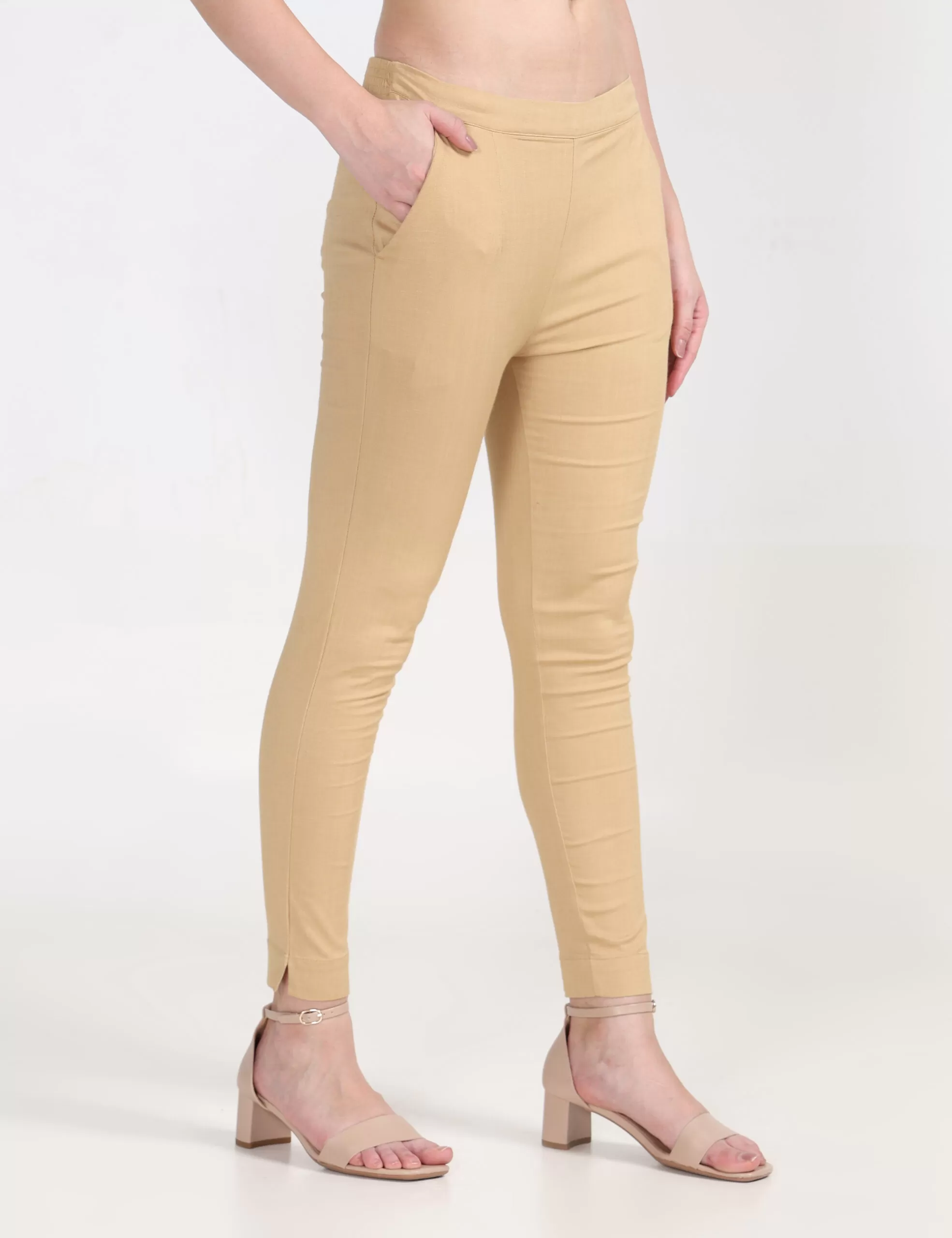 Cream solid ankle-length leggings has an elasticated waistband and slip-on closure.